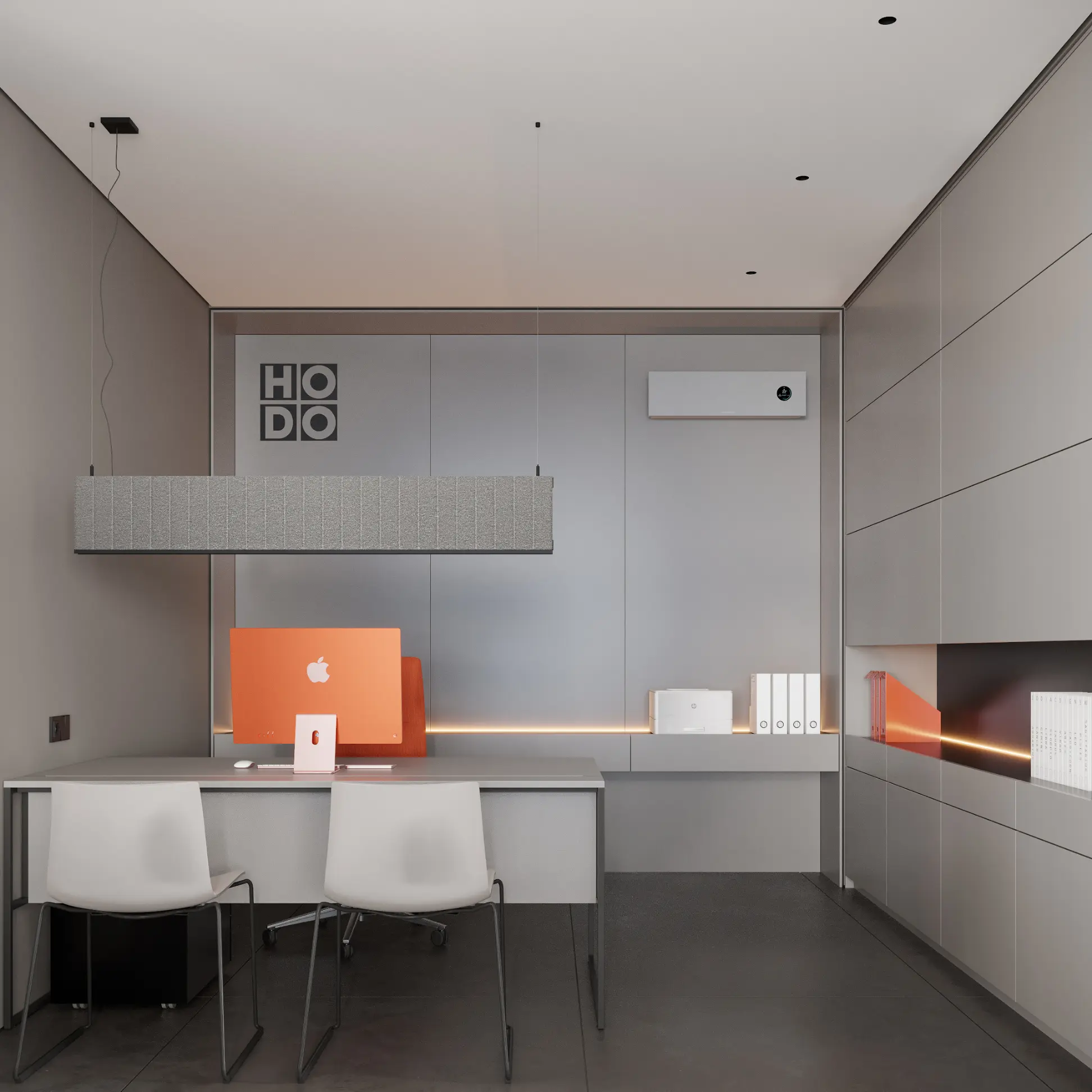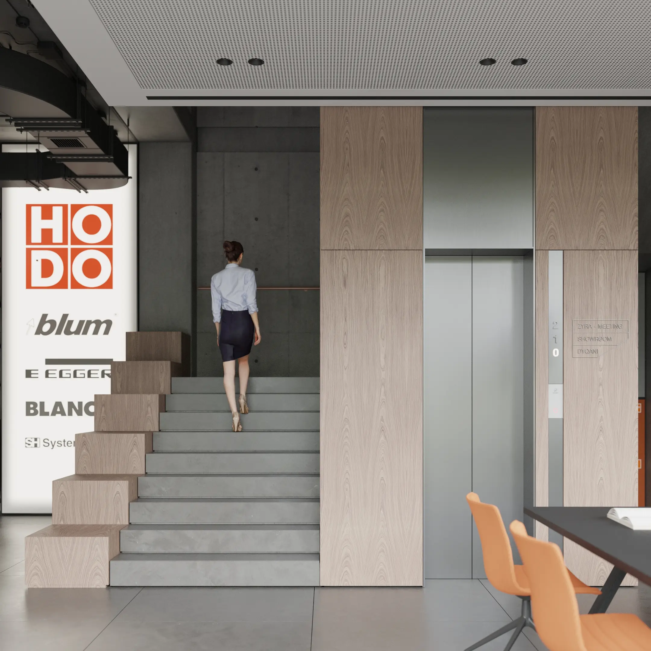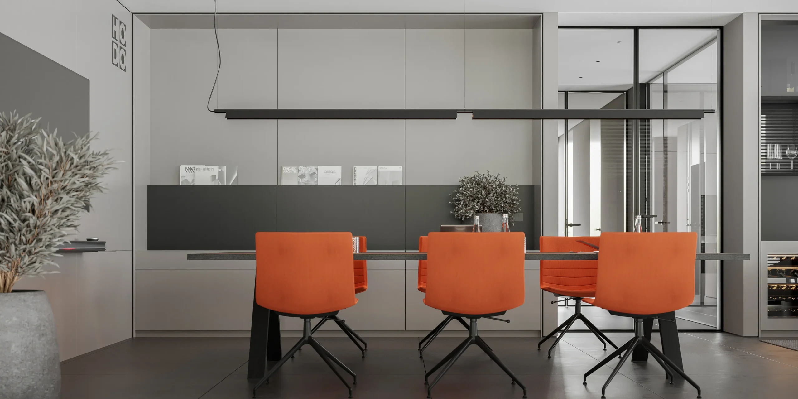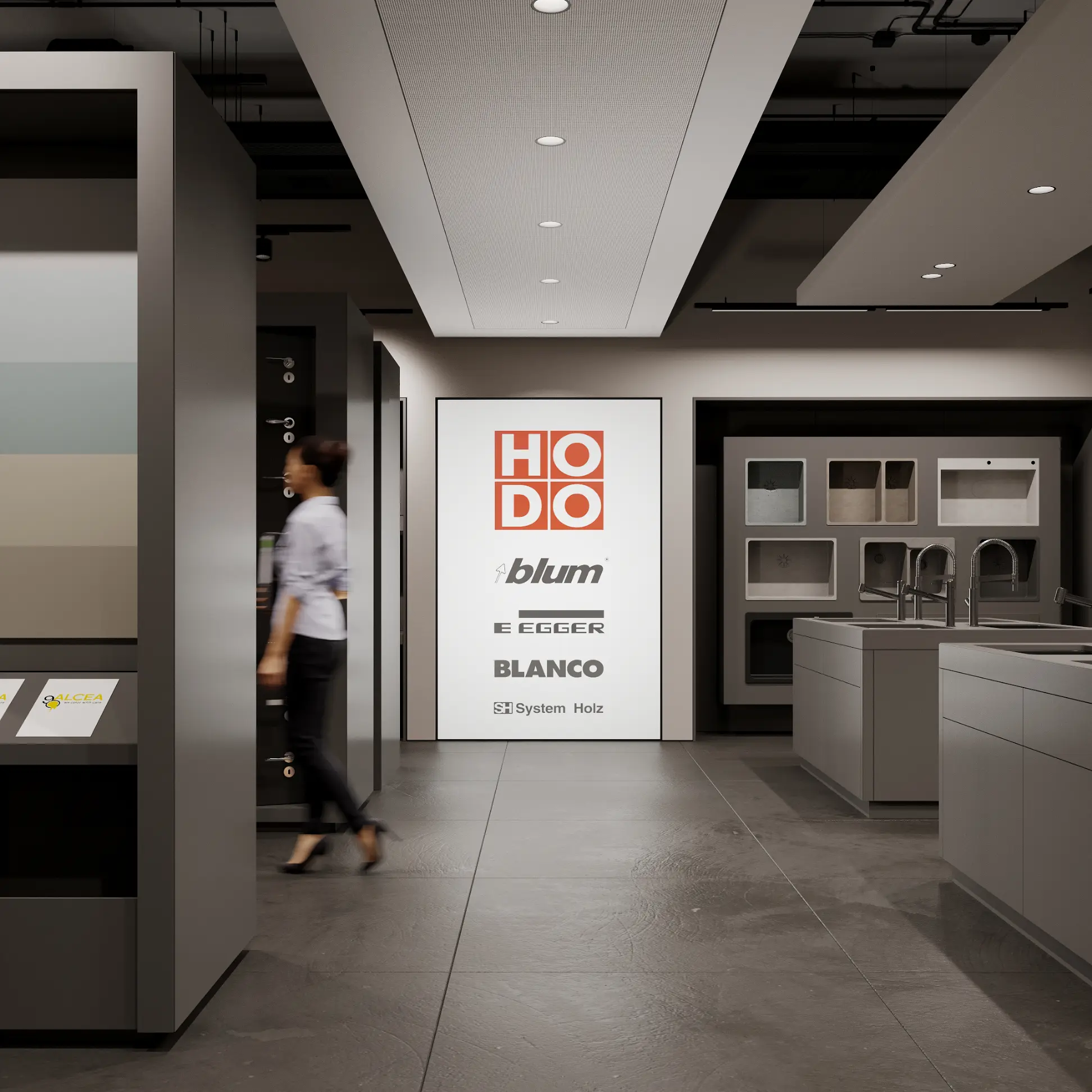 Showroom Hodo is a dynamic space dedicated to showcasing the latest in innovative architecture and design from leading brands. With a focus on cutting-edge products and visionary concepts, the showroom offers a curated selection of solutions for residential and commercial spaces.The interior palette is dominated by soothing grays, providing the perfect backdrop for the minimalist architecture to shine. Clean lines and sleek surfaces define the space, creating an ambiance of effortless modernity.Large windows allow natural light to flood the room, casting soft, diffused rays that dance across the polished surfaces, creating a sense of openness and airiness. Strategic placement of recessed LED lights further enhances the luminous quality of the space, illuminating every corner with a warm, inviting glow.