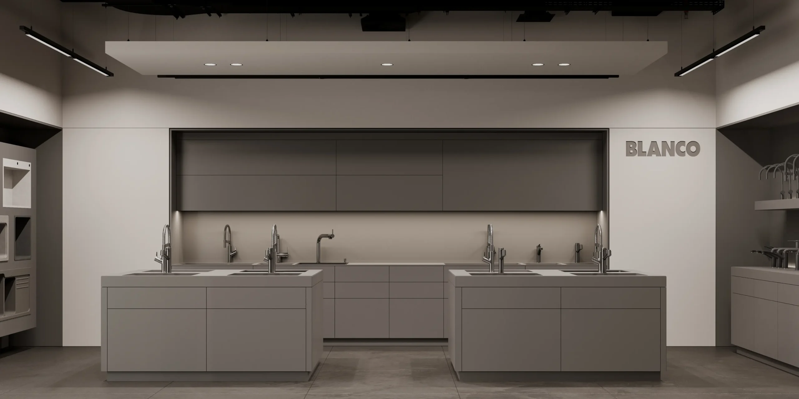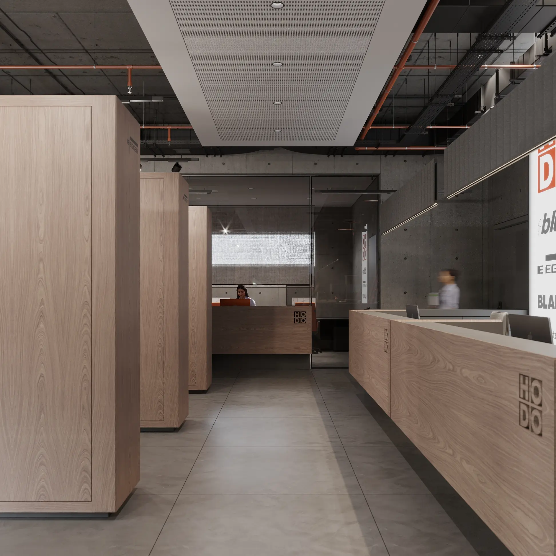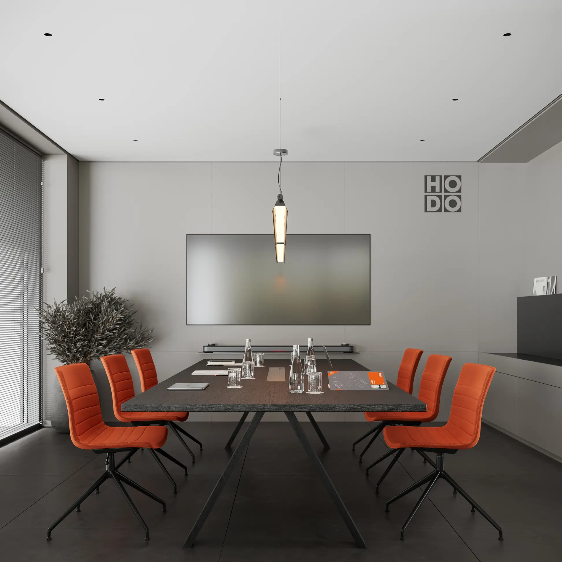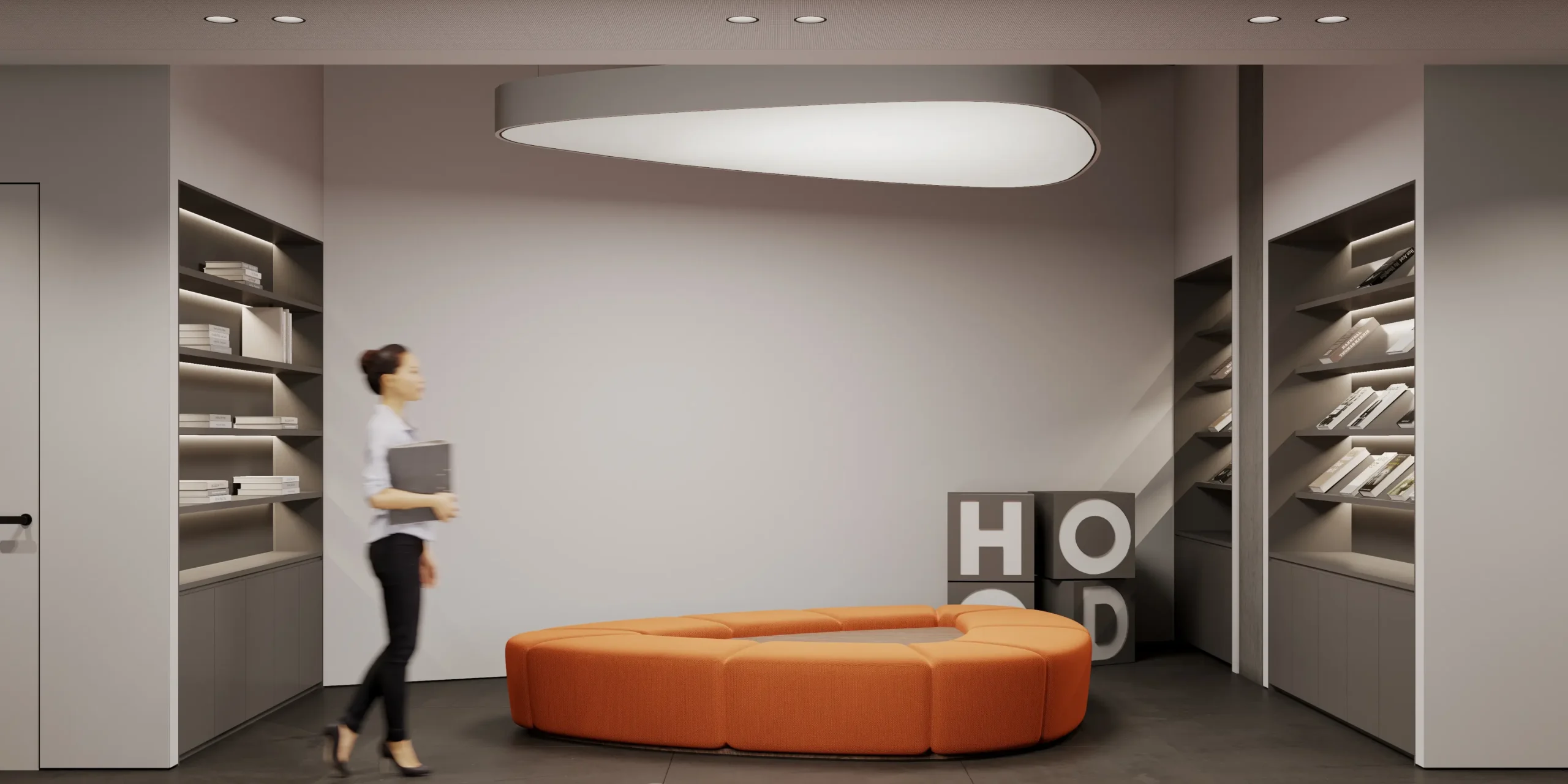 Showroom Hodo is a dynamic space dedicated to showcasing the latest in innovative architecture and design from leading brands. With a focus on cutting-edge products and visionary concepts, the showroom offers a curated selection of solutions for residential and commercial spaces.The interior palette is dominated by soothing grays, providing the perfect backdrop for the minimalist architecture to shine. Clean lines and sleek surfaces define the space, creating an ambiance of effortless modernity.Large windows allow natural light to flood the room, casting soft, diffused rays that dance across the polished surfaces, creating a sense of openness and airiness. Strategic placement of recessed LED lights further enhances the luminous quality of the space, illuminating every corner with a warm, inviting glow.