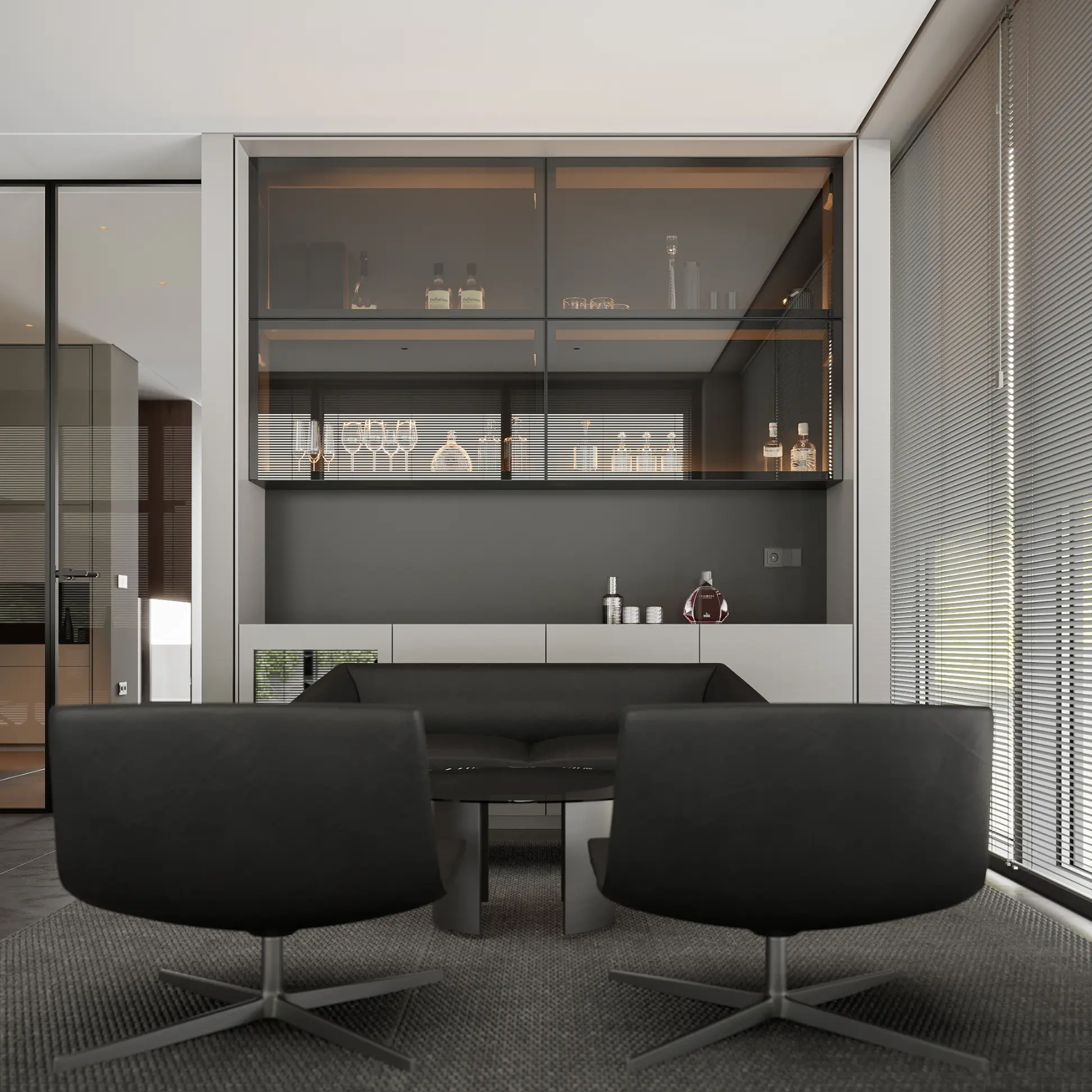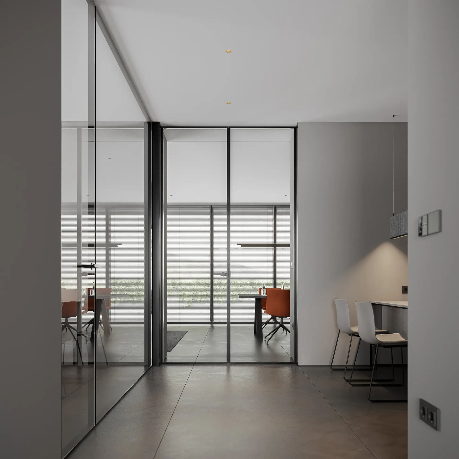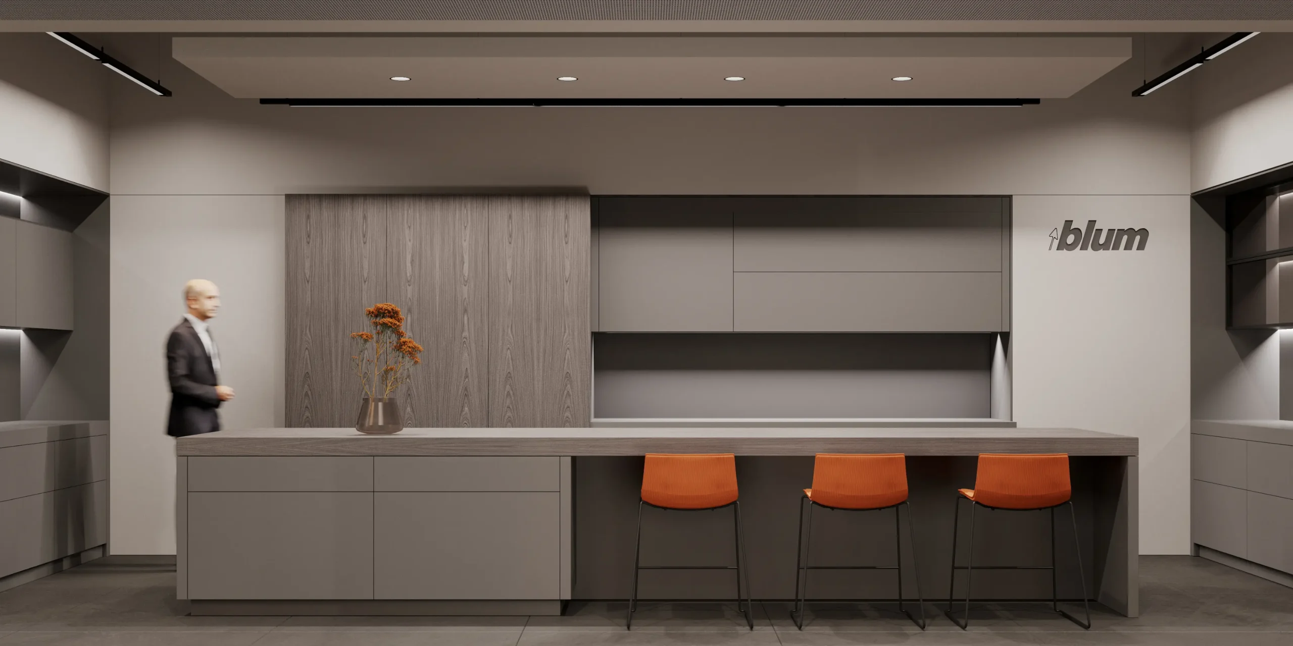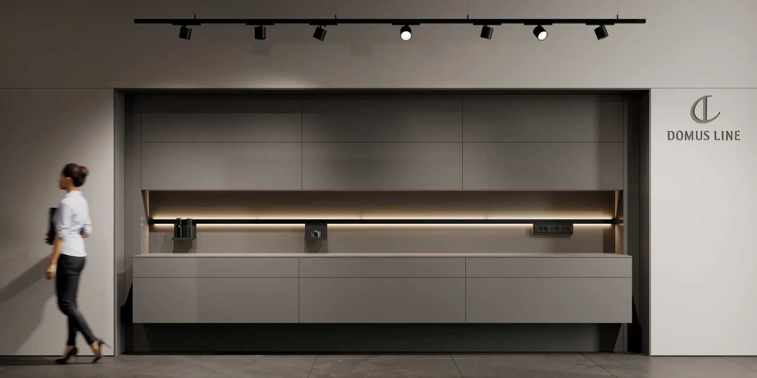 Showroom Hodo is a dynamic space dedicated to showcasing the latest in innovative architecture and design from leading brands. With a focus on cutting-edge products and visionary concepts, the showroom offers a curated selection of solutions for residential and commercial spaces.The interior palette is dominated by soothing grays, providing the perfect backdrop for the minimalist architecture to shine. Clean lines and sleek surfaces define the space, creating an ambiance of effortless modernity.Large windows allow natural light to flood the room, casting soft, diffused rays that dance across the polished surfaces, creating a sense of openness and airiness. Strategic placement of recessed LED lights further enhances the luminous quality of the space, illuminating every corner with a warm, inviting glow.
