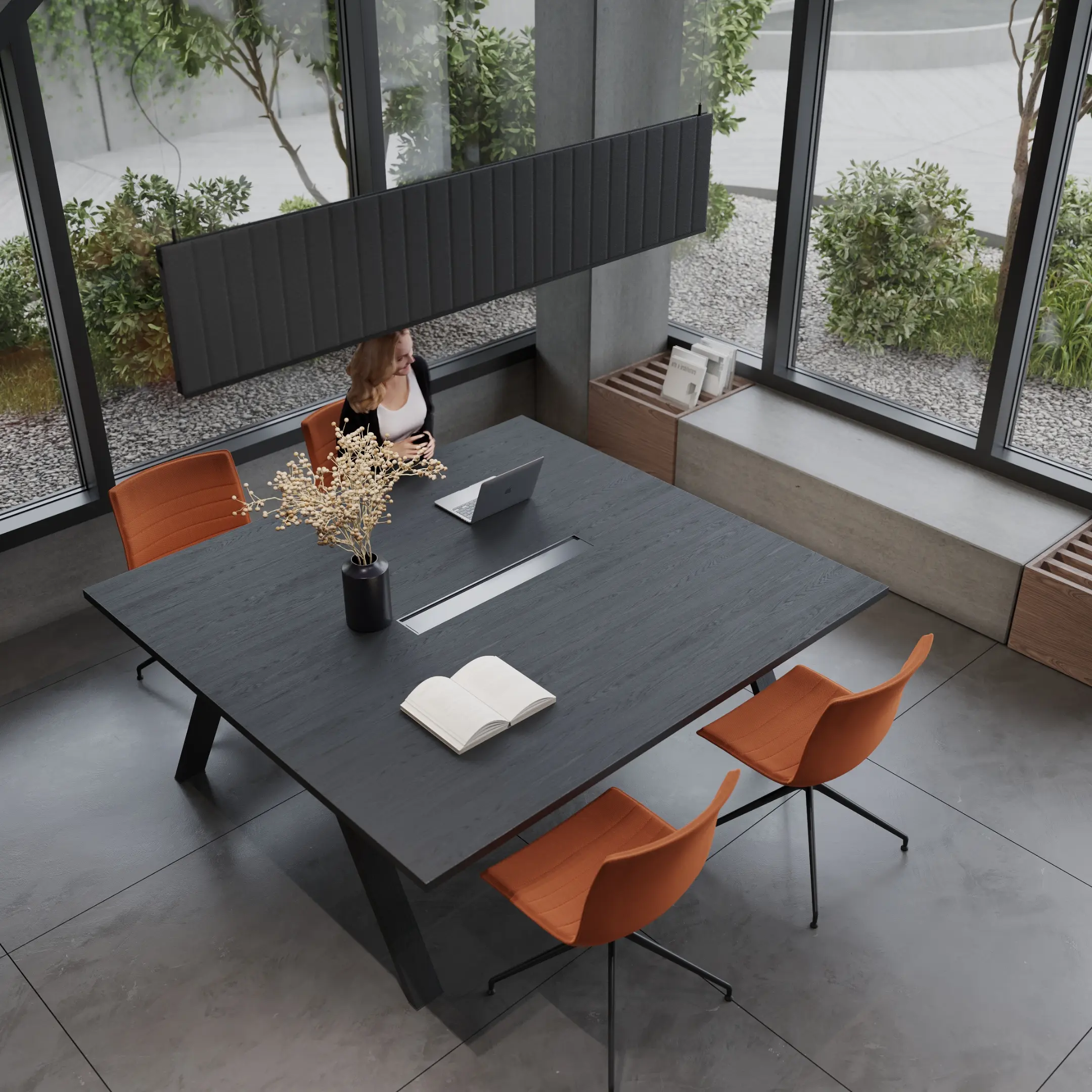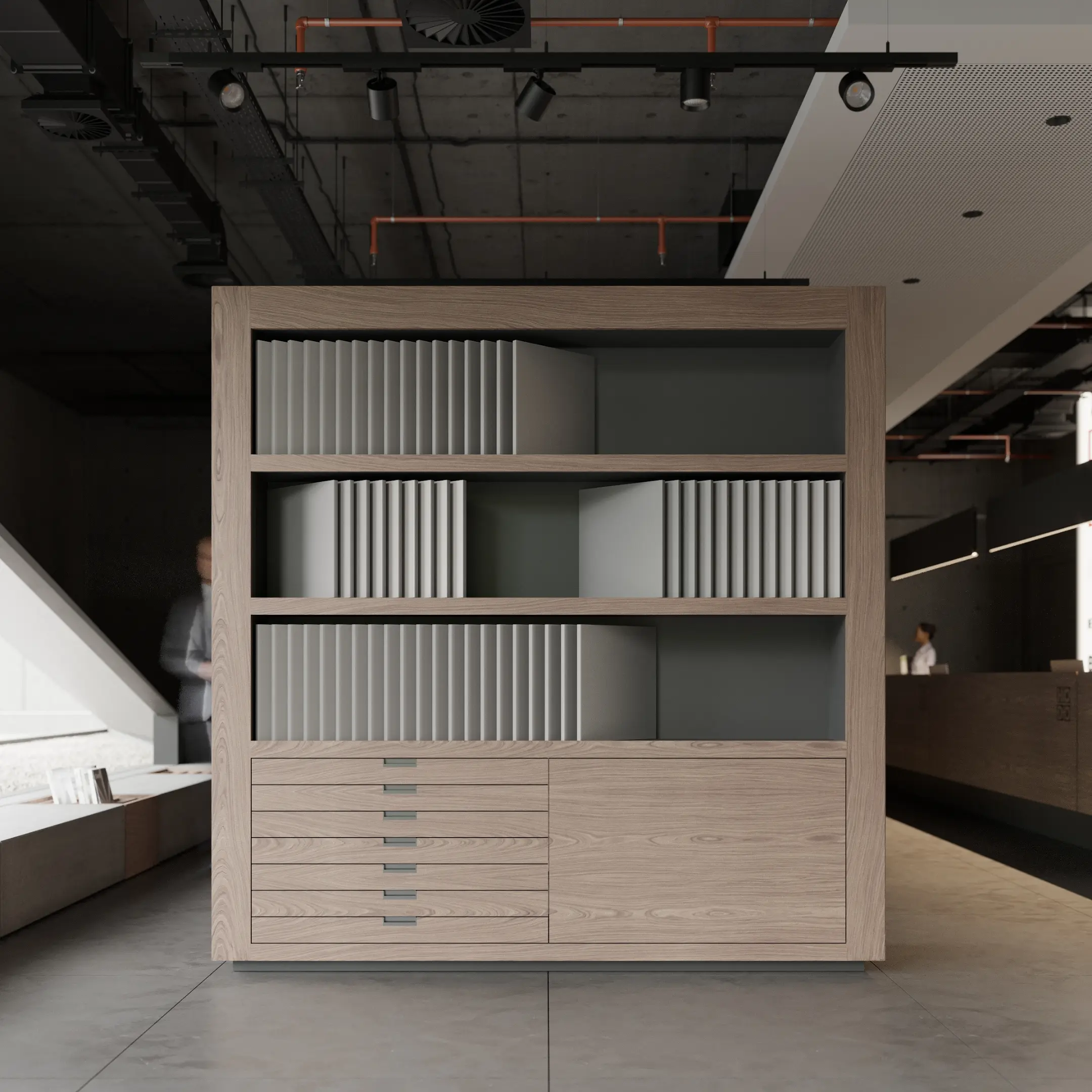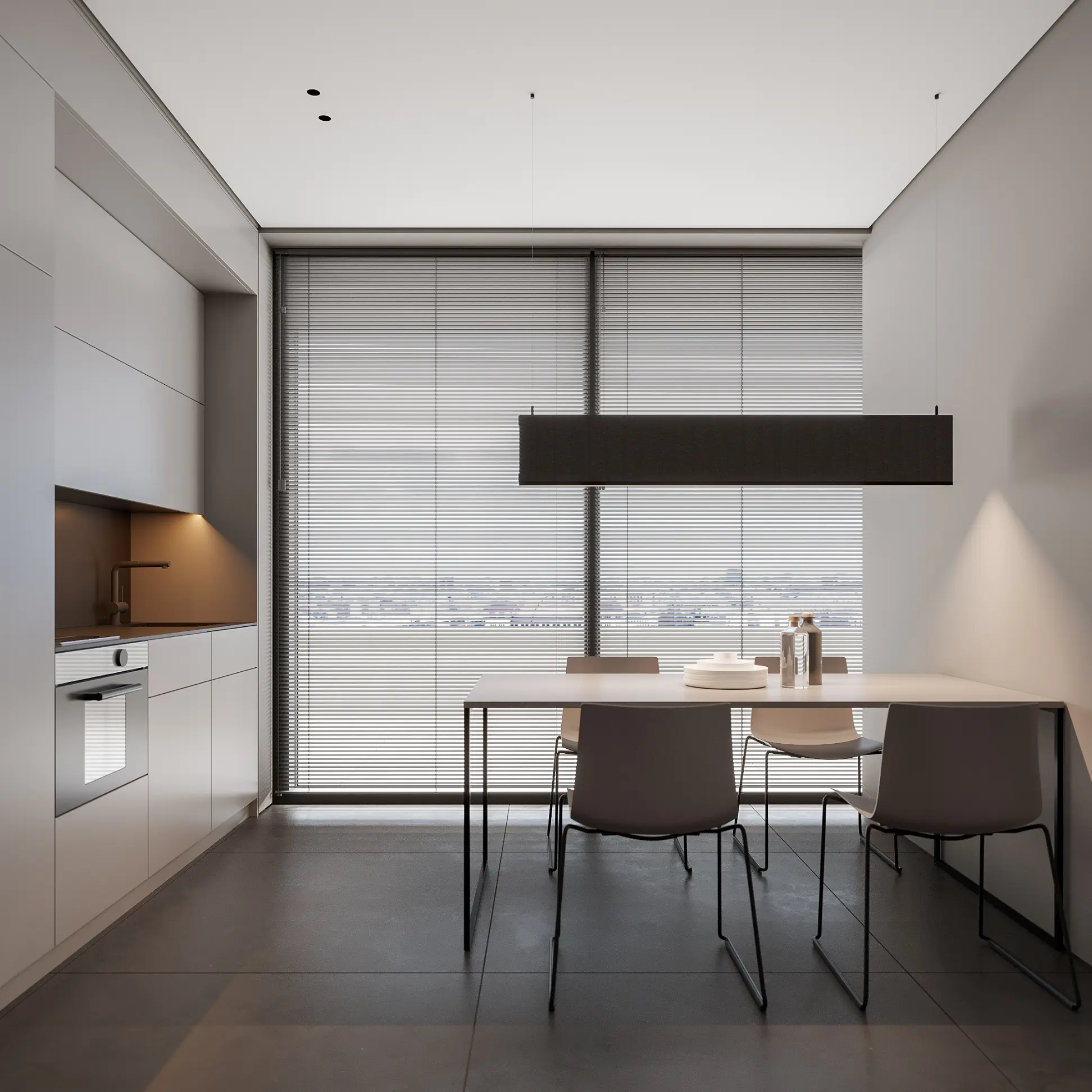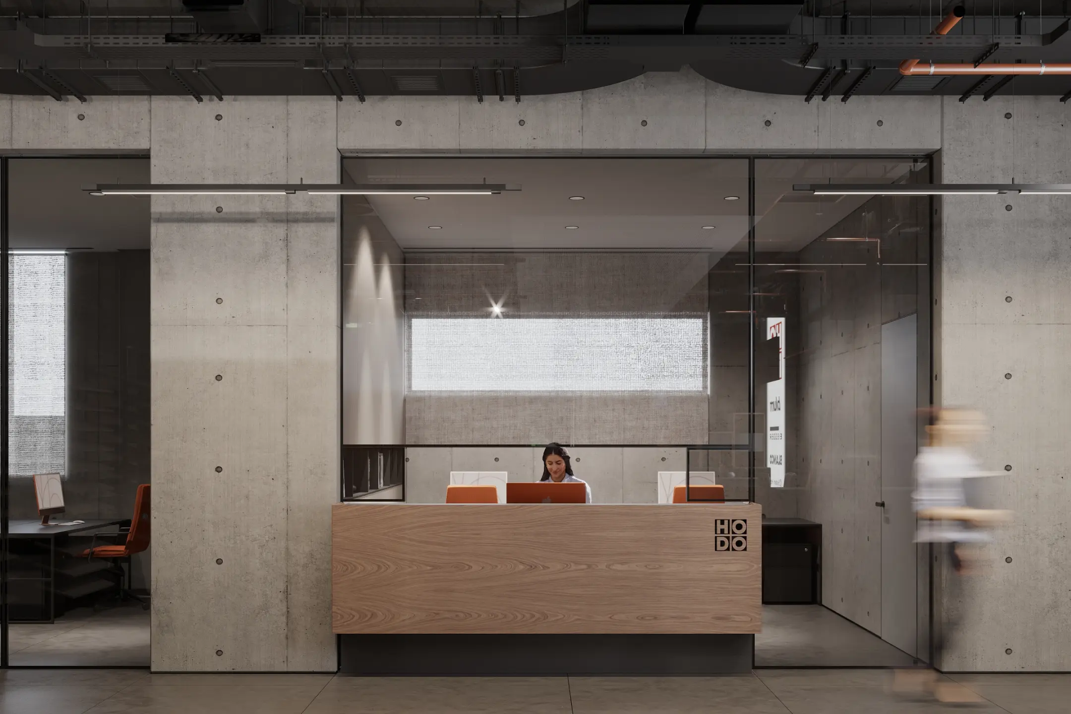 Showroom Hodo is a dynamic space dedicated to showcasing the latest in innovative architecture and design from leading brands. With a focus on cutting-edge products and visionary concepts, the showroom offers a curated selection of solutions for residential and commercial spaces.The interior palette is dominated by soothing grays, providing the perfect backdrop for the minimalist architecture to shine. Clean lines and sleek surfaces define the space, creating an ambiance of effortless modernity.Large windows allow natural light to flood the room, casting soft, diffused rays that dance across the polished surfaces, creating a sense of openness and airiness. Strategic placement of recessed LED lights further enhances the luminous quality of the space, illuminating every corner with a warm, inviting glow.